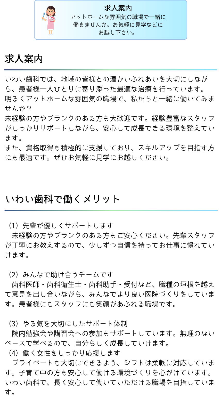 | 応募の流れ | 電話応募(院内の見学は可能です) ↓↓↓↓↓ お電話で面接日を決定 ↓↓↓↓↓ 面接(必要に応じて書類選考あり) ↓↓↓↓↓ 内定・採用をお伝えします |
